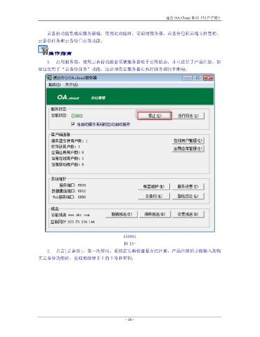速达 OA.Cloud 系列《用户手册》 云备份功能集成在服务器端,使用此功能时,需启用服务器。云备份包括云端文件管理、 云备份任务和云备份日志等功能。 操作指南 1. 启用服务器:使用云备份功能必须使服务器处于启用状态,并且进行了产品注册,如 果还使用了“云备份任务”功能,还必须保证服务器在执行任务期间不断电; 150801 图 15- 2. 点击[云备份],第一次使用,系统首先将检查是否已注册,产品注册后才能输入您购 买云备份功能时,获取的续费卡上的卡号和密码; - 10 -