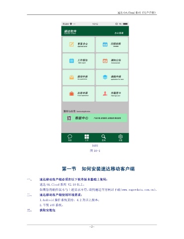 速达 OA.Cloud 系列《用户手册》 1601 图 16-1 第一节 如何安装速达移动客户端 一、 速达移动客户端必须在以下软件版本基础上使用: 速达 OA.Cloud 系列 V2.10 以上; 如果您的软件版本与上述要求不符,请到速达官方网站下载(www.superdata.com.cn)。 二、 速达移动客户端使用环境要求: 1.Android 操作系统支持:4.2 及以上版本; 2.苹果 iOS 系统。 三、 获取安装包 - 2 -