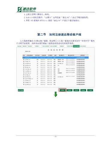 1.直接在官网扫描相关二维码; 2.Android 系统直接在 “应用宝”官网搜索“速达 OA”产品后下载安装使用; 3.苹果 iOS 系统在 APPStore 搜索“速达 OA”产品后下载安装使用。 第二节 如何注册速达移动客户端 在开始使用速达 OA 移动客户端前,您需要在 C/S 客户端进行注册并取得“全局应用”账号 后才能登录系统,具体内容请查询客户端帮助系统或问询系统管理员。 - 3 -