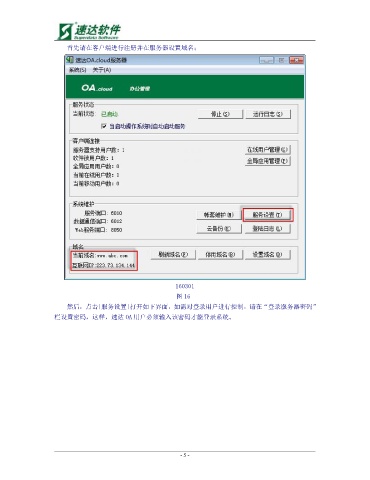 首先请在客户端进行注册并在服务器设置域名; 160301 图 16- 然后,点击[服务设置]打开如下界面,如需对登录用户进行控制,请在“登录服务器密码” 栏设置密码,这样,速达 OA 用户必须输入该密码才能登录系统。 - 5 -