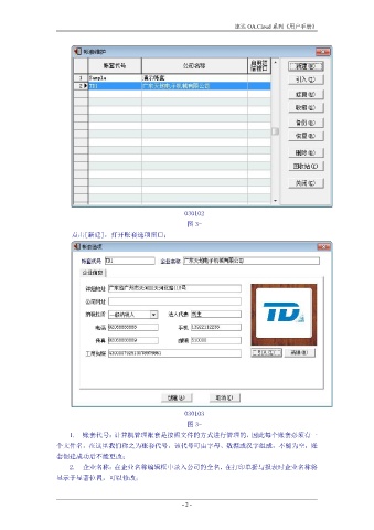 速达 OA.Cloud 系列《用户手册》 030102 图 3- 点击[新建],打开账套选项窗口; 030103 图 3- 1. 账套代号:计算机管理账套是按照文件的方式进行管理的,因此每个账套必须有一 个文件名,在这里我们称之为账套代号,该代号可由字母、数据或汉字组成,不能为空,账 套创建成功后不能更改; 2. 企业名称:在企业名称编辑框中录入公司的全名,在打印单据与报表时企业名称将 显示于显著位置,可以修改; - 2 -