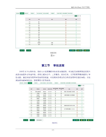 速达 OA.Cloud《用户手册》 060201 图 6- 第三节 审批流程 企业针对不同的业务,将纳入审批范围的业务预设审批流程,业务提交时按照既定流程生 成真实流程自动传递审批。系统在通知公告、工作报告、综合行政、人事管理等模块提供了审 批功能,通过对业务类型审批流程的设置,可实现对各项业务当中的各类申请进行审批,以达 到加强内部审核制度、掌控费用开支等目的。 060301 - 2 -