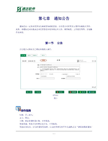 第七章 通知公告 通知是在一定职员范围内发布需要知晓的信息,公告是公司所有员工都应知晓的大事件。 此外,本模块还可以收录企业经营管理中的各类技术文件、规章制度、工作指引等等,方便操 作员查阅。 第一节 公告 公告是公司所有员工都应知晓的大事件。 070101 图 7- 操作指南 标题:手工录入; 正文:同上; 日期:默认新增时的日期,不可修改; 发布范围:发布公告时默认全公司,不可修改; 发送内部信息:打勾时通知发布时,自动在即时信息平台生成格式为“请阅读最新通知/ - 1 -