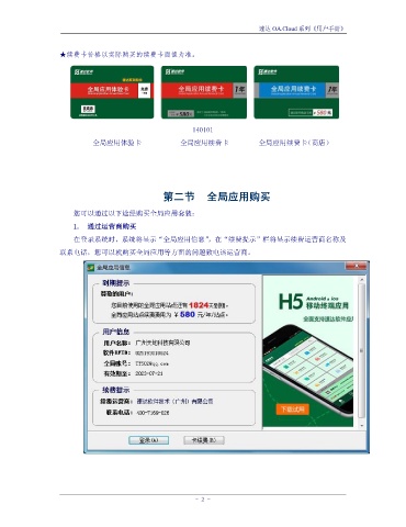 速达 OA.Cloud 系列《用户手册》 ★续费卡价格以实际购买的续费卡面值为准。 140101 全局应用体验卡 全局应用续费卡 全局应用续费卡(商店) 第二节 全局应用购买 您可以通过以下途经购买全局应用套装: 1. 通过运营商购买 在登录系统时,系统将显示“全局应用信息”,在“续费提示”栏将显示续费运营商名称及 联系电话,您可以就购买全局应用等方面的问题致电该运营商。 - 2 -